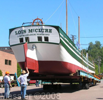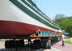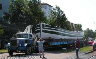 The work of several years took three days to actually move. The first day we drove the boat out through the just big enough door and onto the adjacent parking lot.