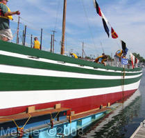 It took several more hours to ease the Lois McClure into the water, with Scott Berky, Norman Messier and his brother Joe providing the final push to float the schooner off our trailer and into Lake Champlain, where it today serves as a traveling museum piece. (Vermont Maritime Museum)